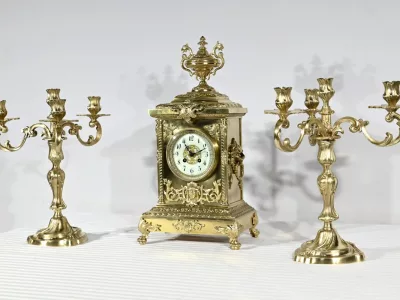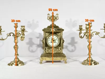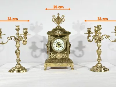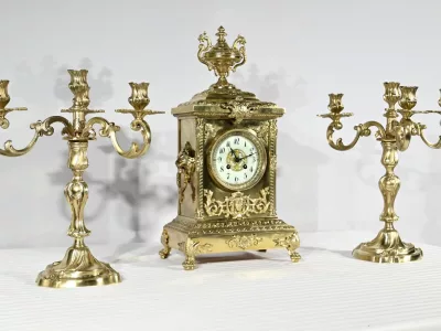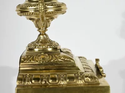 Cette garniture de cheminée en bronze doré se compose d’une horloge estampillée Japy Frères & Cie ainsi qu’une paire de chandeliers.