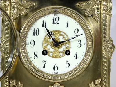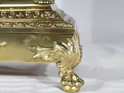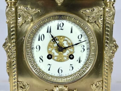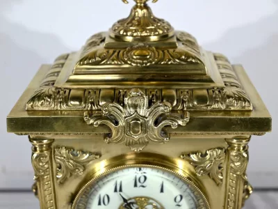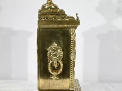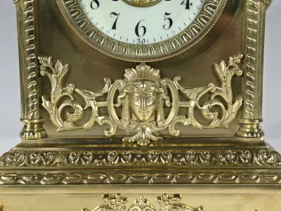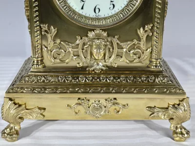 L’horloge rectangulaire étagée figure des décors de feuille d’acanthe, de frises et d’un masque de déesse sur sa façade.