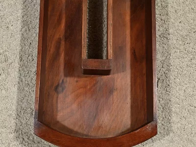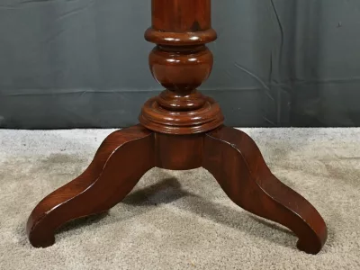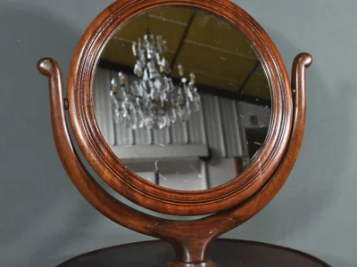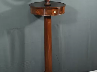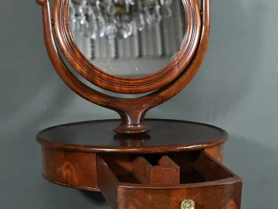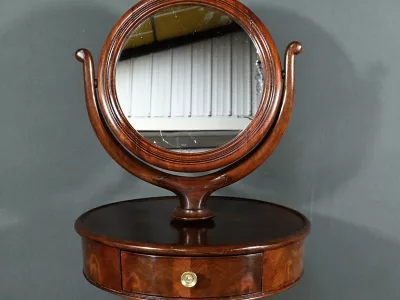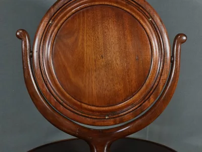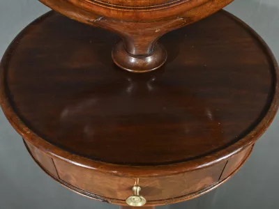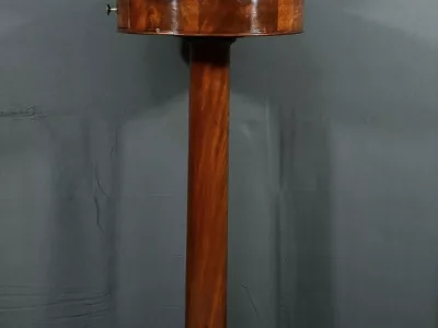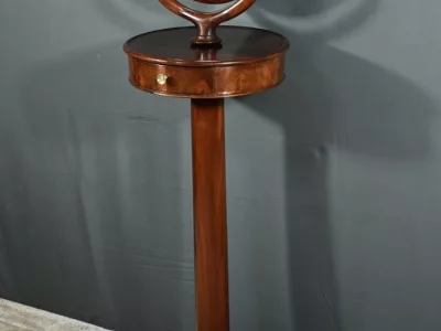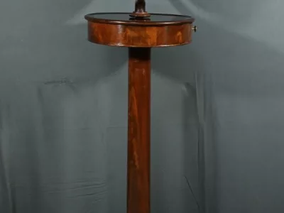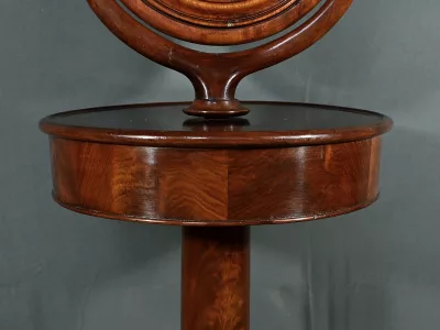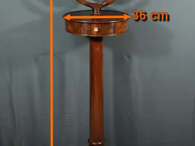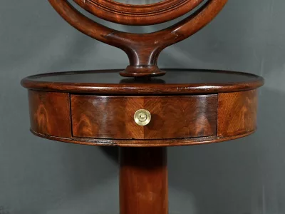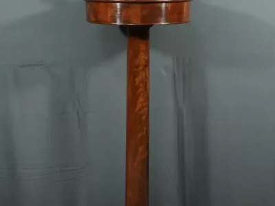 Cette barbière en acajou massif, datant de l’époque Restauration au début du XIXe siècle, est une pièce de mobilier élégante et raffinée. Elle se compose d’un miroir rond inclinable, encadré par une structure en bois courbé reposant sur une base circulaire avec plateau cuvette et tiroir avec poignée en laiton ciselé. Le fût cylindrique repose sur une base tripode sculptée de pieds mouvementés, assurant la stabilité du meuble. Ce meuble est typique de l’époque Restauration, caractérisée par un retour à des formes classiques et une utilisation de matériaux nobles comme l’acajou.