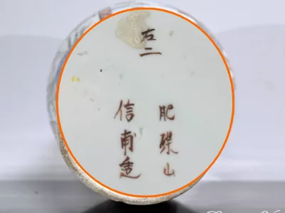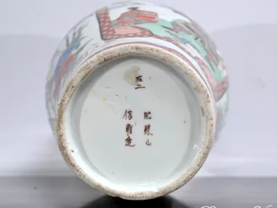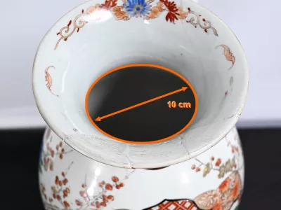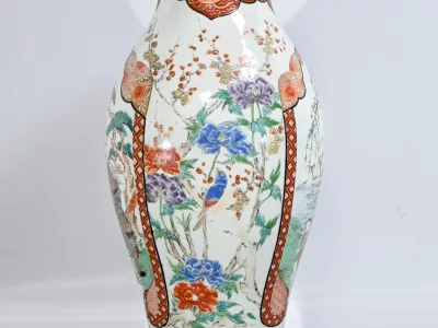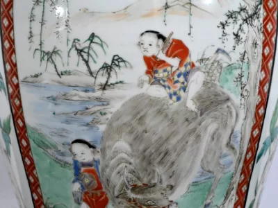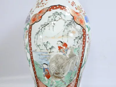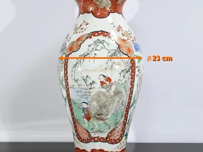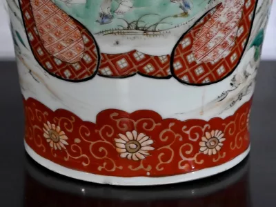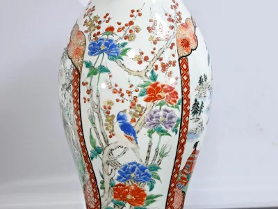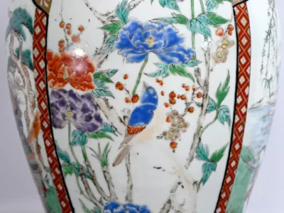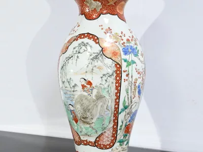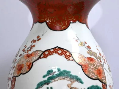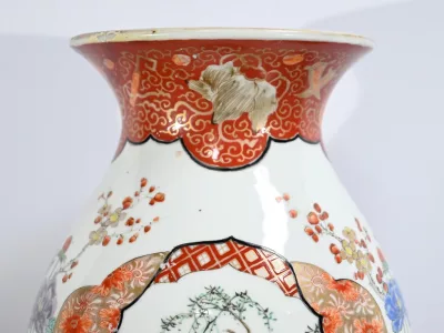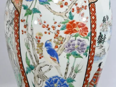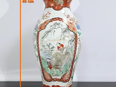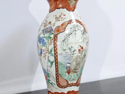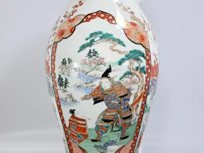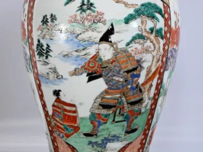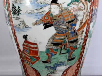 Ce vase, à col évasé, à décors de branchages accompagnés d’oiseaux colorés sur fond de paysages stylisés est illustré de frises de couleur rouge souligné d’or. Deux scènes en cartouches y figurent également. Sur une face, un samouraï représenté en disproportion, tant ses hommes sont importants pour la culture japonaise, tend un message à une femme agenouillée. Sur l’autre face une vache est guidée par deux enfants.