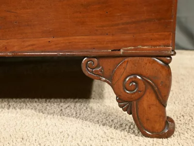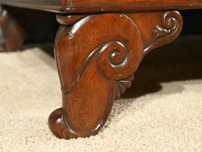 Reposant sur quatre pieds finement découpés et sculptés en forme d’escargot, cette méridienne témoigne du savoir-faire artisanal de l’époque.