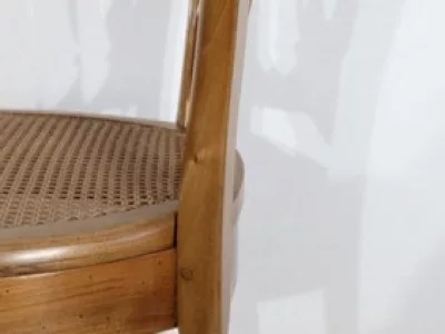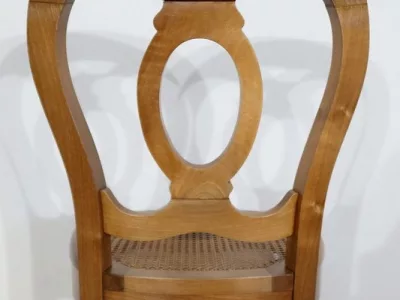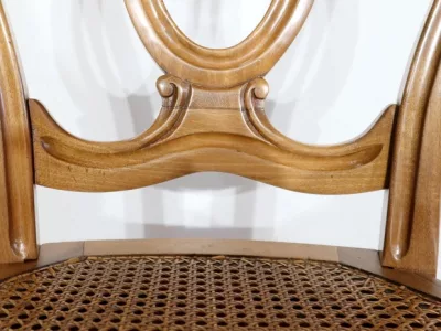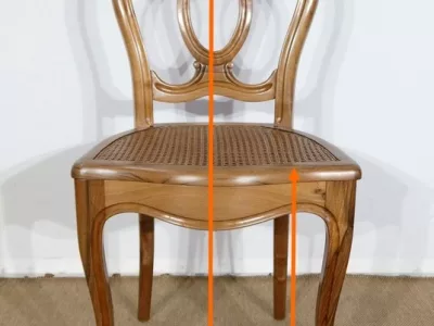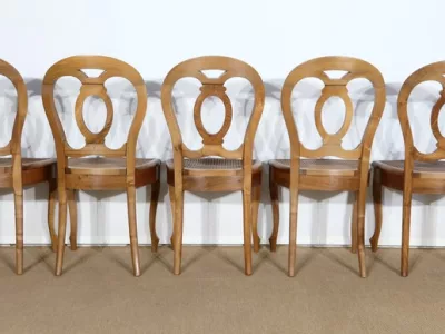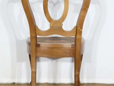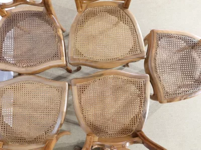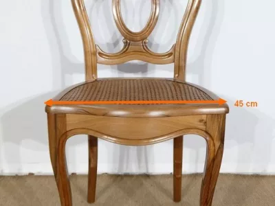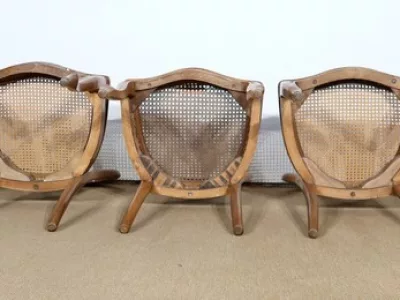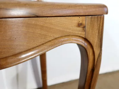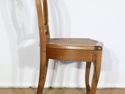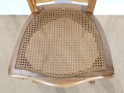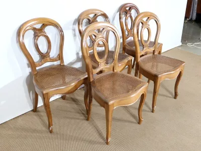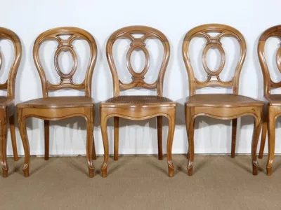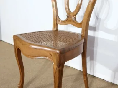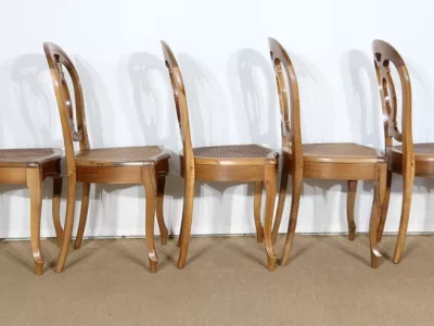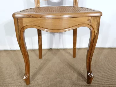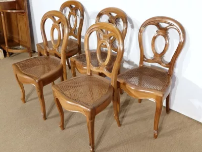 Élégant ensemble de 5 Chaises en Noyer Massif, de style Louis XV. Leur dossier ajouré, en forme d’anse de panier en partie supérieure, consiste en plusieurs éléments de bois avec gorges en forme de volutes, avec une partie ovalisée en son centre. Ces chaises bénéficient d’une confortable et solide assise en cannage avec encadrement en noyer, équerrée par le dessous. À noter les fixations par vis, permettant aisément de refaire l’assise dans le futur, au besoin. Elles présentent un piètement de qualité, relié par de larges traverses, consistant en un devant légèrement galbé se terminant en pied-de-biche : une moulure à gorge vient harmoniser les pieds et la traverse avant, finement ventrue et découpée. Les pieds arrières affichent une forme sabre, et offrent une continuité avec le dossier.