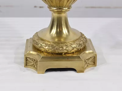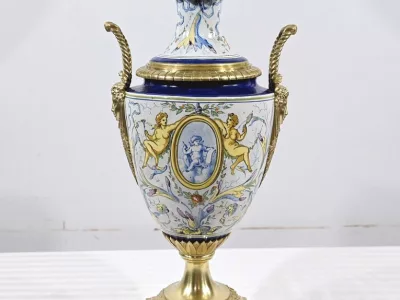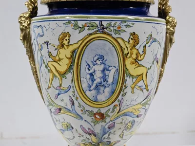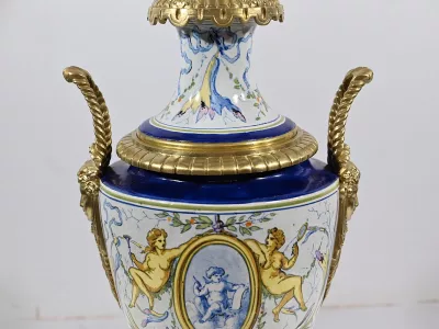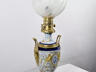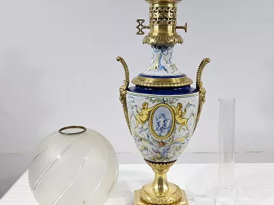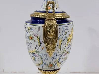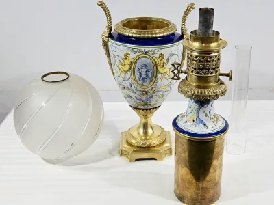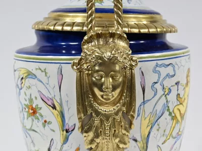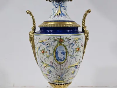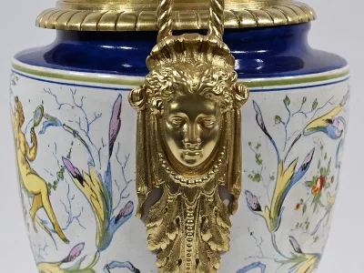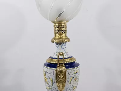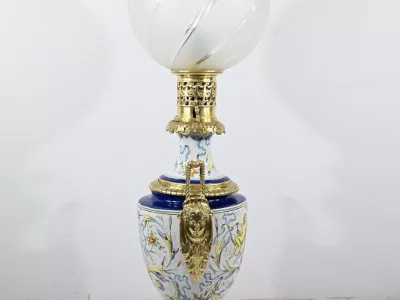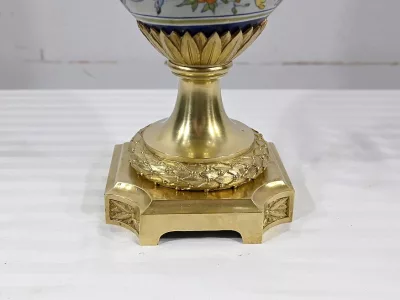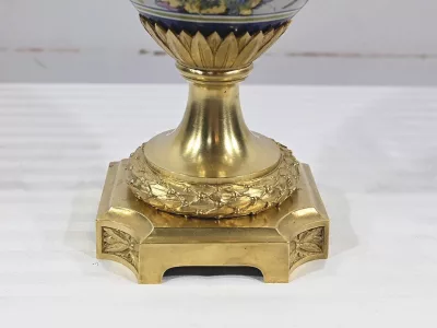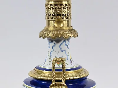 Une large collerette en bronze sculpté de feuilles compose le col de ce luminaire. Le corps formant un vase est peint de fleurs multicolores et est orné de médaillons centraux. De chaque côté, des anses accolées en bronze représentent des visages féminins coiffés de palmettes.