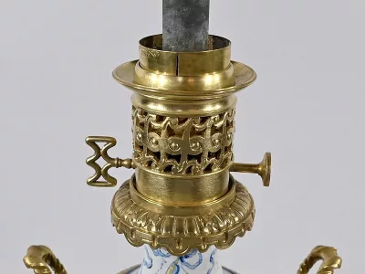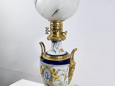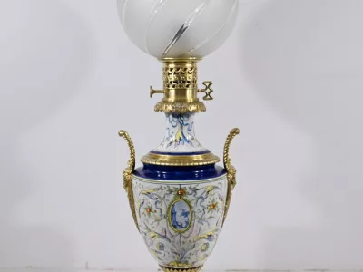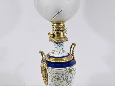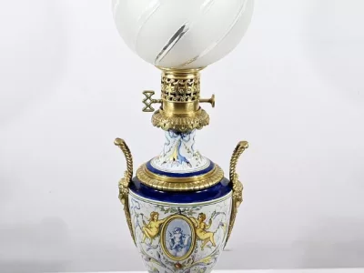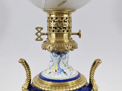 Lampe à pétrole en faïence polychrome, ornementée de bronze et munie d’un globe gravé de sillons courbes.