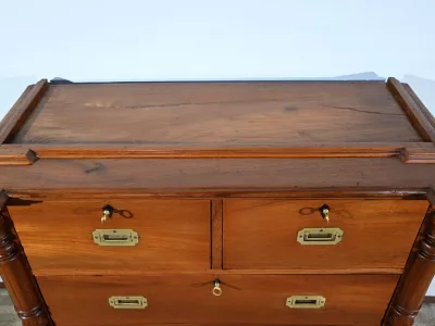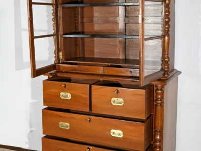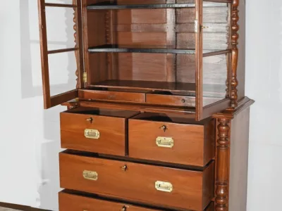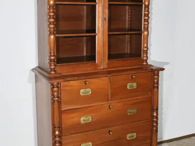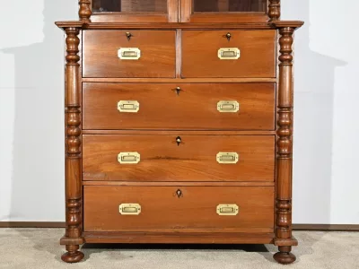 Ce meuble en deux éléments comporte en partie inférieure une commode dans l’esprit marine.