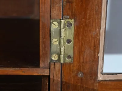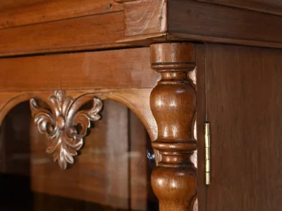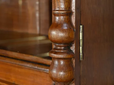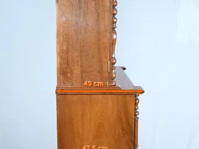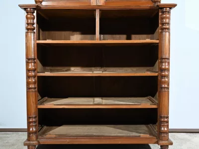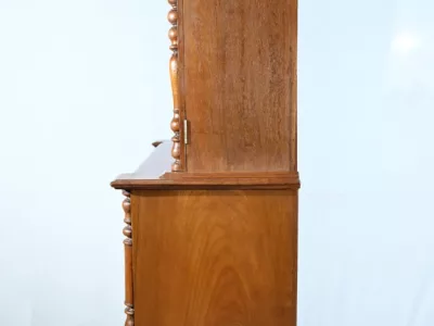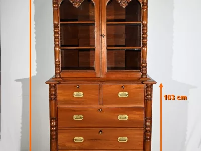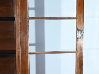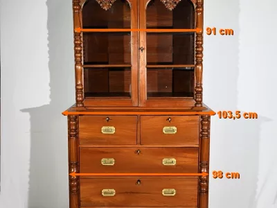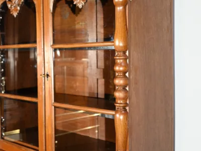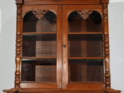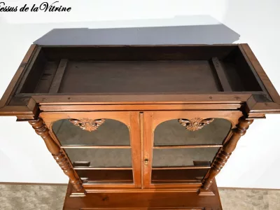 Ce meuble présente également une vitrine en retrait en partie supérieure, soit une double porte vitrée à encadrement, barreaudée et à colonnes attenantes.
