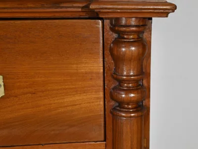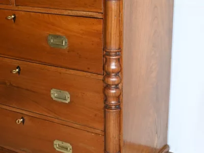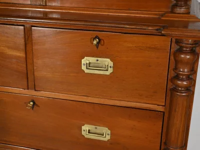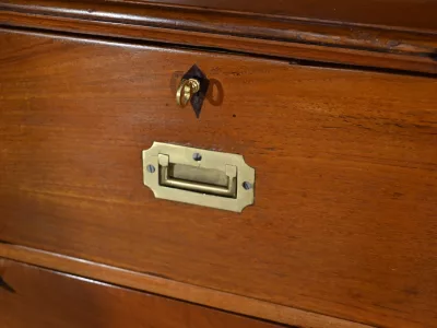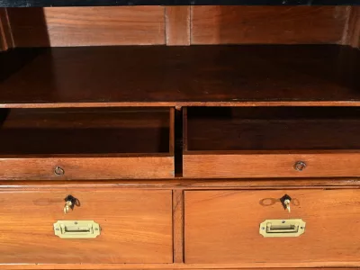 Tous munis de poignées incrustées dites « bateau » en laiton, ces tiroirs sont équipés de serrures fonctionnelles d’origine avec entrées losange en palissandre et leurs clés ajustées.