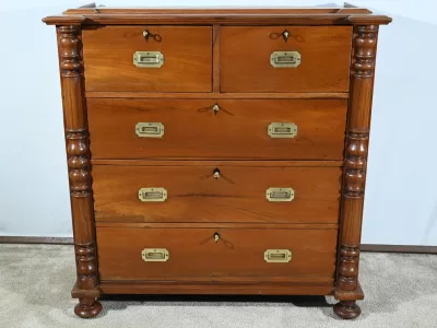 Cette commode ouvre par cinq tiroirs, à savoir deux petits en haut et trois grands en bas.