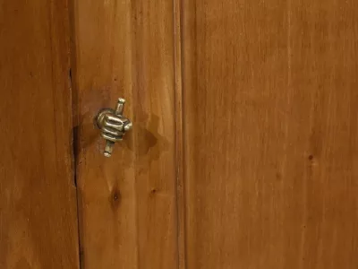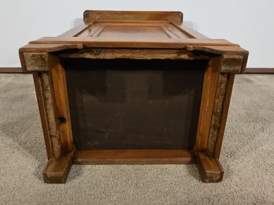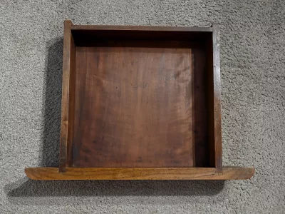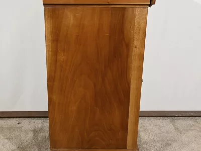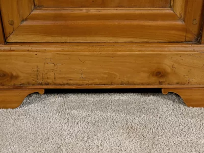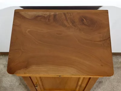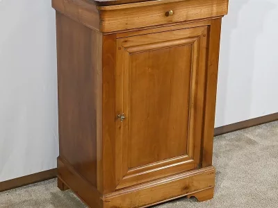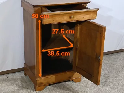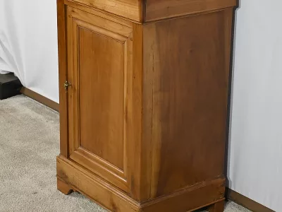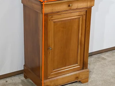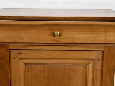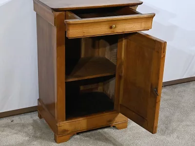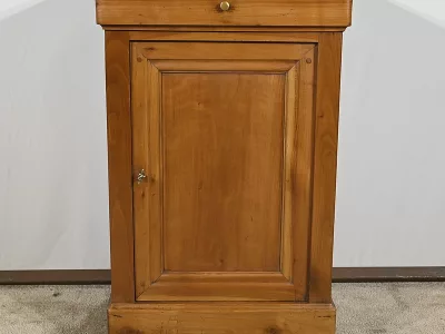 Meuble régional en merisier massif ouvrant en façade par un tiroir à doucine se tirant par un bouton laiton. Une porte à cadre à coupe d’onglet chevillé possède une large moulure vers l’intérieure et est foncée d’un seul panneau. Nous retrouvons une main en laiton avec fermeture taquet pour l’ouverture de la porte. L’intérieur est doté d’une étagère.