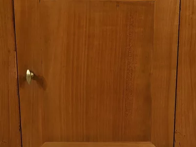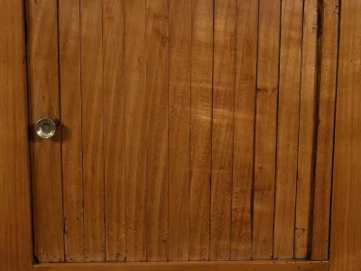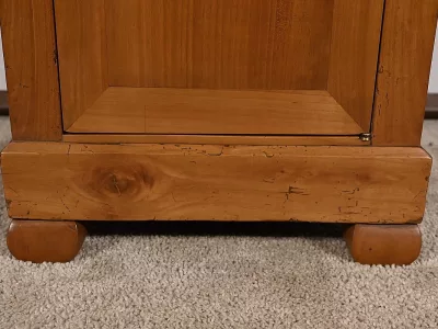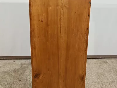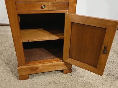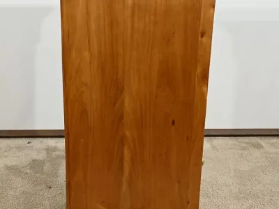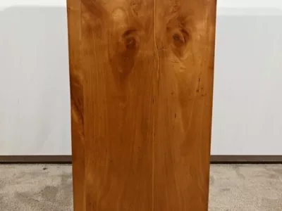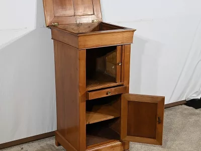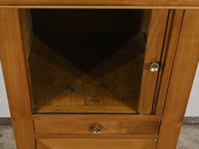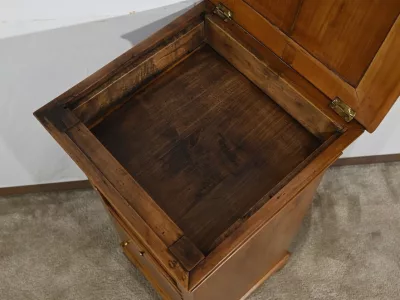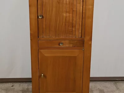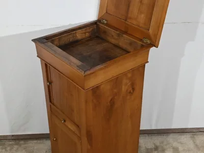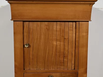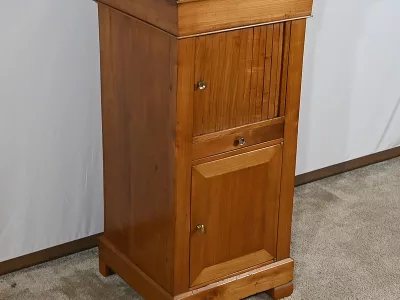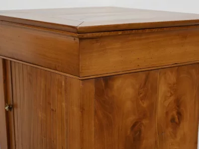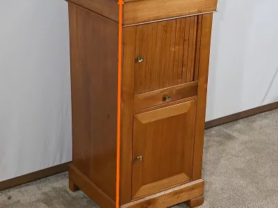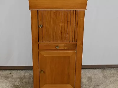 Meuble en Merisier toutes faces composé d’une ceinture légèrement en forme vers le haut et souligné d’une baguette. En façade, la partie haute est dotée d’un rideau en lamelles de bois coulissant, muni d’un bouton cuvette.
