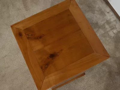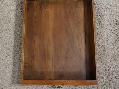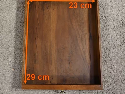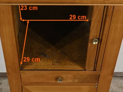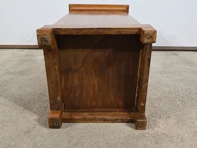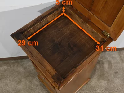 Le dessus de ce meuble est formé deux panneaux entourés d’un cadre. Il s’agit d’un abattant s’ouvrant sur charnières, dévoilant un espace de rangement.