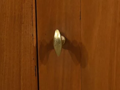 Enfin, ce meuble possède une porte avec encadrement à coupe d’onglet foncée d’un seul panneau. Un pivot laiton débord se tire et se ferme.