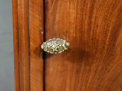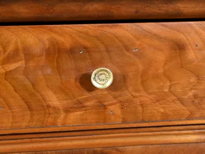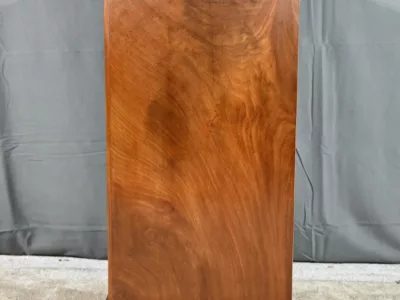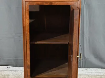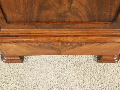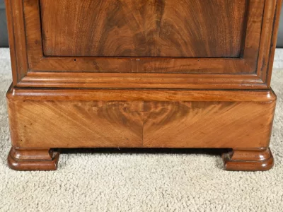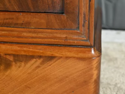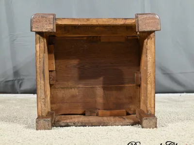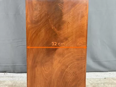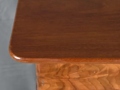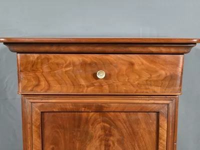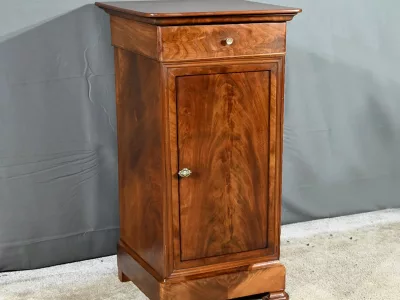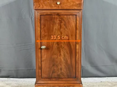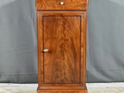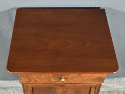 Ce chevet présente un tiroir en ronce d’acajou, à bouton cuvette, en ceinture et ouvre par une porte également foncée d’un seul panneau en ronce avec poignée tournante et loquet.