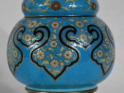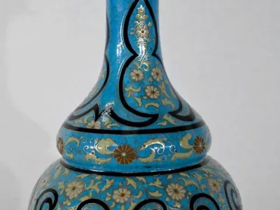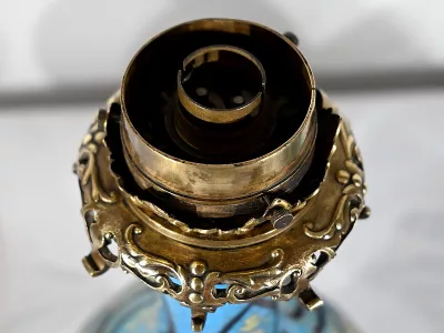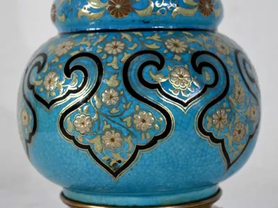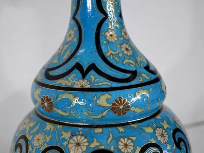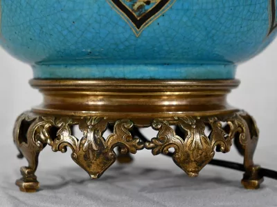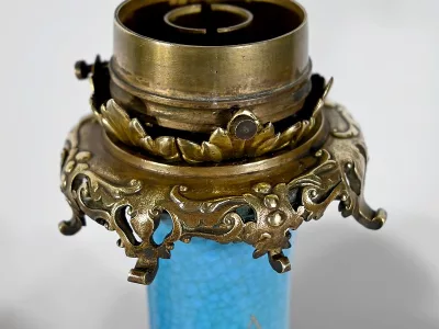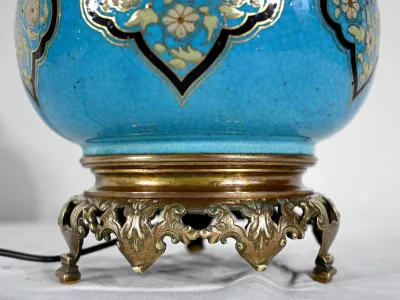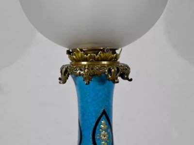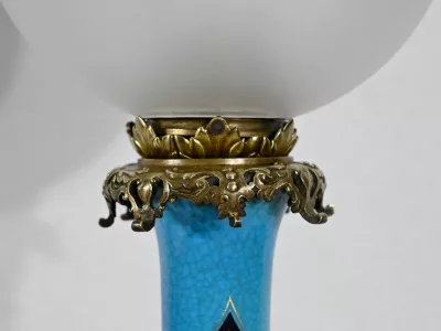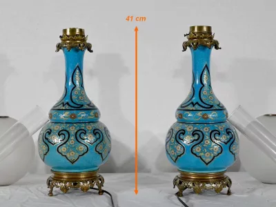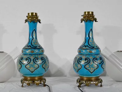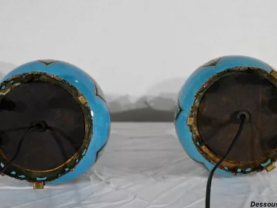Les panses à double bulbe sont ornées de décors en relief de fleurs et de feuilles en émaux, sur fond couleur bleu céleste, soulignés par des motifs fantaisistes noirs et dorés. Les cols évasés sont sommés de larges collerettes, en bronze, ouvragées de feuilles d’acanthe à enroulement et de rinceaux. Ces luminaires reposent sur des socles tripodes, à gorge, ouvragés de petits bourgeons et d’éléments végétaux.