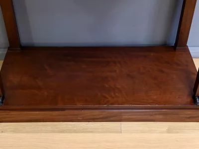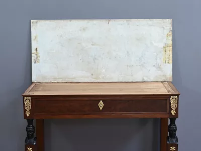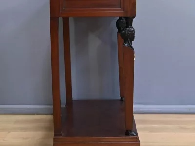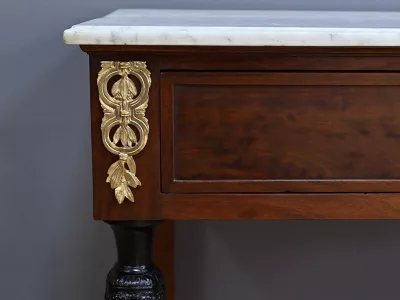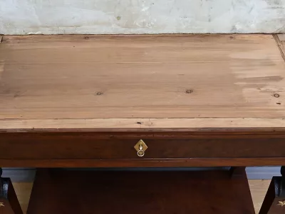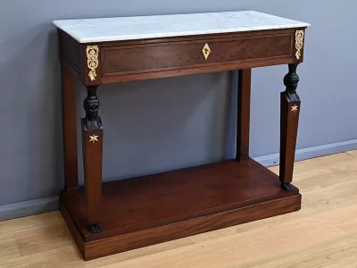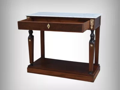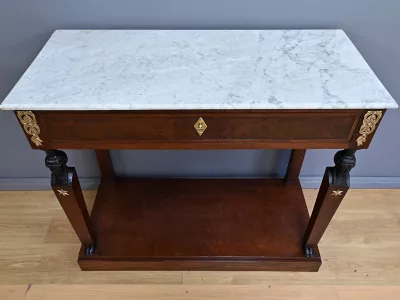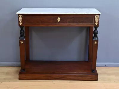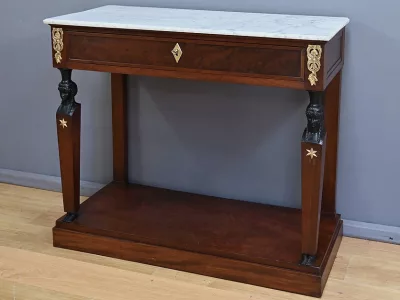 Cette somptueuse console en acajou et placage d’acajou, datant du début du XIXe siècle, incarne toute la grandeur du style Empire et l’influence du goût pour l’Égypte antique qui marqua cette époque. Elle constitue une pièce rare, à la fois décorative et historique.