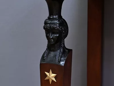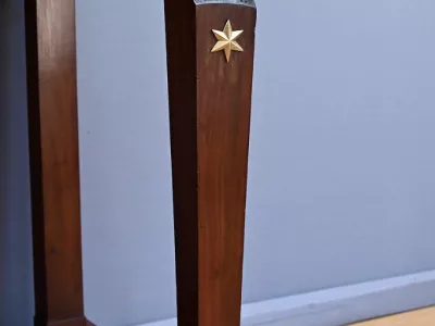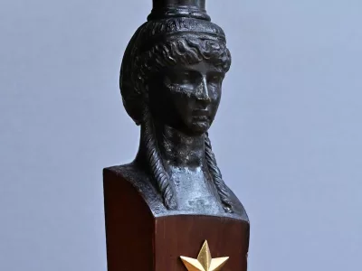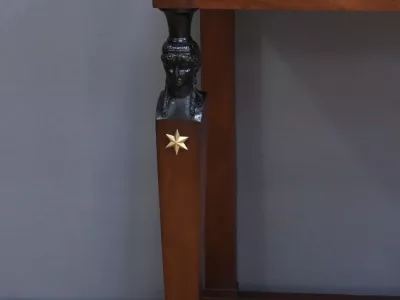 Les montants de cette console s’affinent gracieusement vers le bas, conférant à l’ensemble une silhouette élancée et équilibrée. En partie haute, deux cariatides finement sculptées apportent une présence sculpturale saisissante. Elles sont soulignées chacune d’étoile en bronze doré attirant le regard. En partie basse, nous retrouvons des petits pieds sculptés en bois noirci.