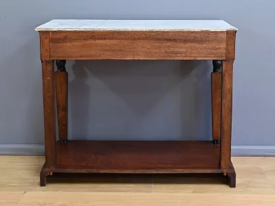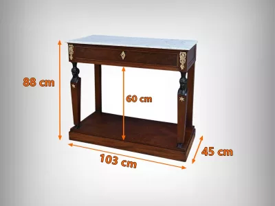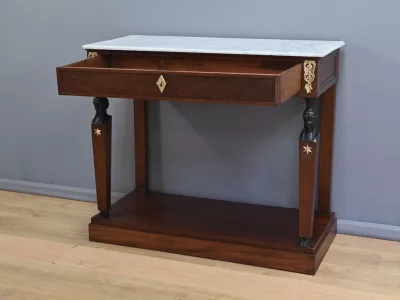 La console est couronnée d’un superbe plateau en marbre blanc de Carrare, dont la luminosité contraste magnifiquement avec la chaleur profonde de l’acajou.