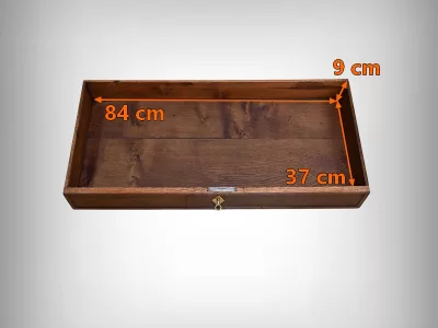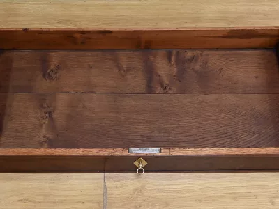 Le tiroir en ceinture est orné d’une entrée de serrure en forme de losange. Cette dernière est accompagnée d’une clé, avec une serrure parfaitement fonctionnelle. Aux angles supérieurs, des garnitures en bronze viennent enrichir l’ensemble de détails raffinés.