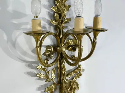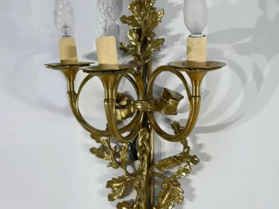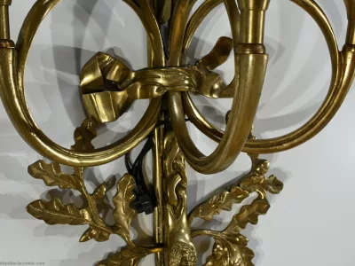 Chaque applique présente trois bras de lumière en forme de cor de chasse, symbolisant l’art de la chasse et le luxe de la cour royale.