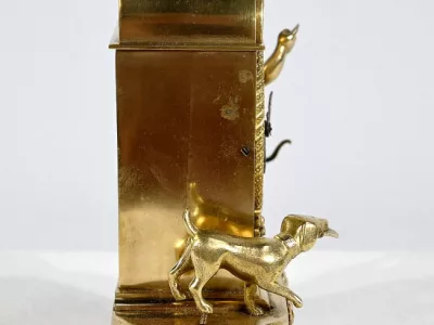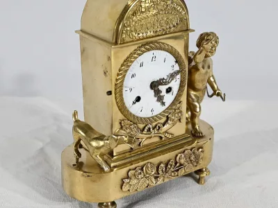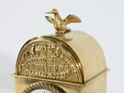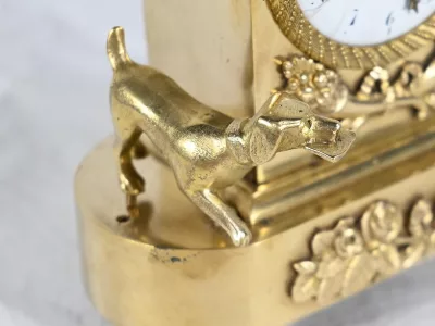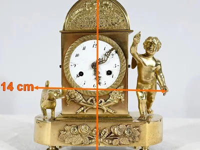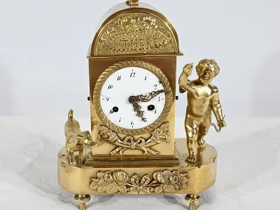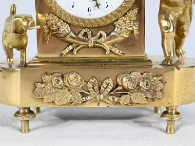 Charmante pendule en bronze doré aux bords légèrement arrondis, dont la façade est ornementée de compositions florales en relief. Cette pendulette repose sur de petits pieds toupie à collerette.