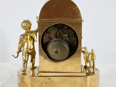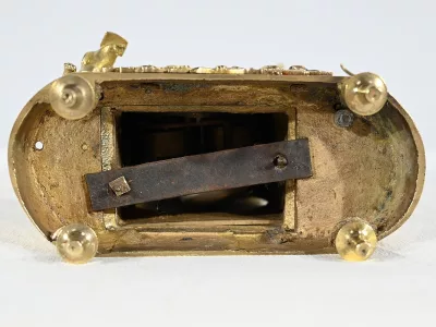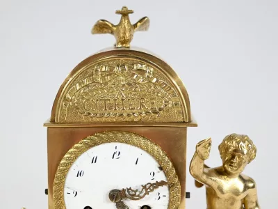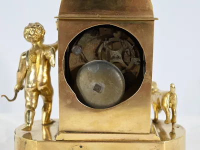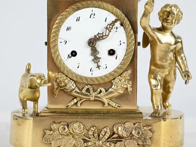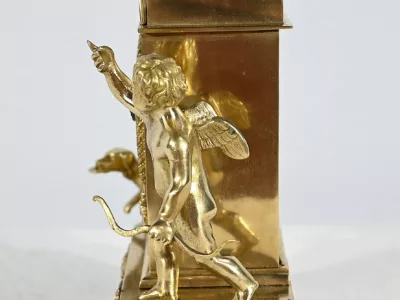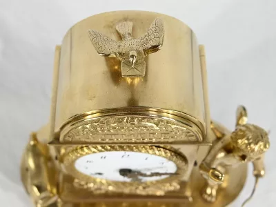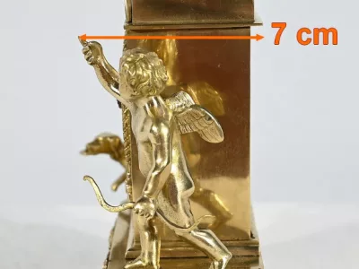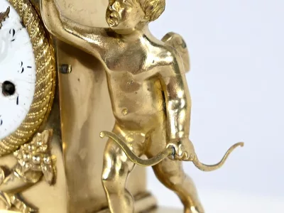 Au centre, nous découvrons un cadran émaillé entouré d’un pourtour bronze ciselé. Deux aiguilles ajourées légèrement à mouvement. La partie supérieure de l’horloge, en forme de demi-cercle, est gravée de feuilles de lauriers, d’un large nœud et d’une inscription : « A Cythère ».