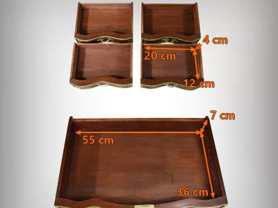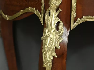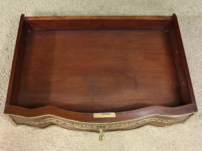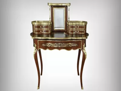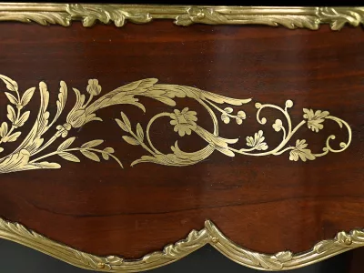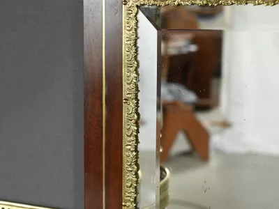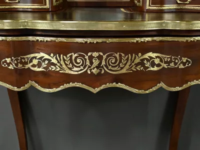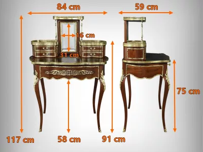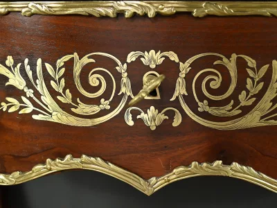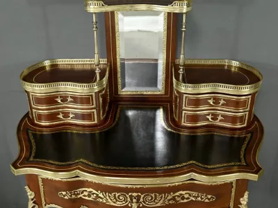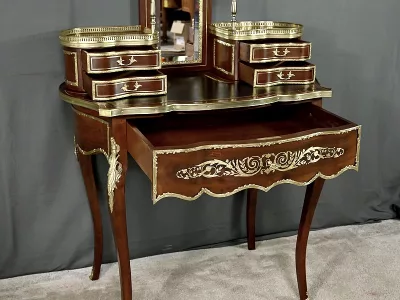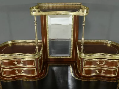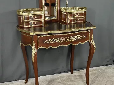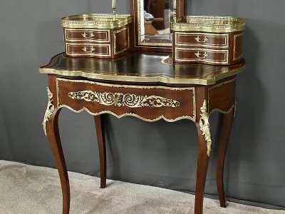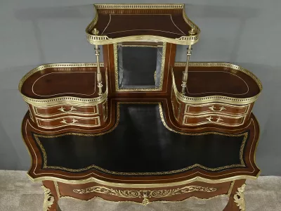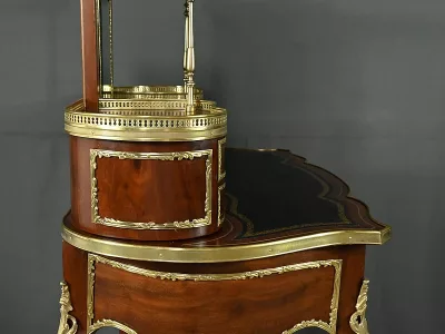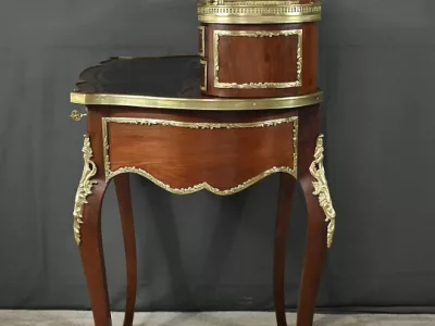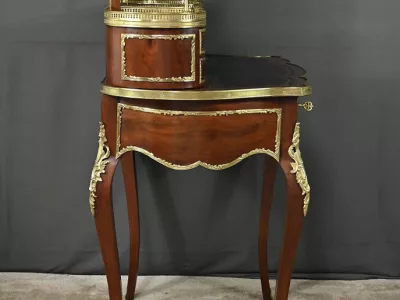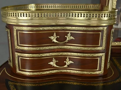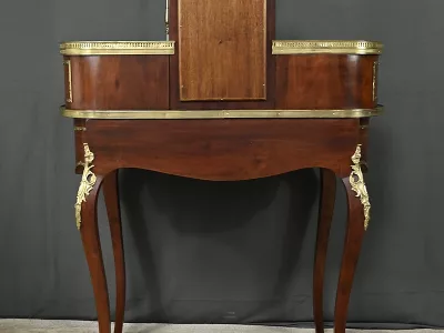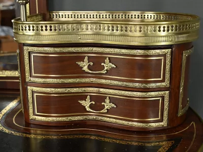 Ce petit bureau de dame en acajou, datant de la seconde moitié du XIXe siècle sous l’époque Napoléon III, est une pièce élégante conçue avec un grand soin du détail. Le plateau, aux formes galbées, est recouvert d’un cuir noir neuf avec vignette dorée, entouré d’une lingotière striée qui souligne son contour. Juste en dessous, un grand tiroir central décoré de baguettes feuillagées et d’une marqueterie de laiton représentant des volutes végétales, s’ouvre grâce à une clé ouvragée et une serrure fonctionnelle. La partie supérieure du bureau est surmontée d’un petit miroir biseauté, sommé d’une tablette avec galerie ajourée. De chaque côté, deux petits tiroirs avec poignées en bronze doré en forme de feuilles d’acanthe complètent l’ensemble. Ils sont également sommés de galeries ajourées. Des filets de laiton et des frises décoratives viennent souligner les contours du miroir et des tiroirs. Les pieds du meuble, très galbés, sont ornés de superbes chutes en bronze doré et se terminent par des ornementations végétales. Ce bureau est une pièce rare, témoignage du savoir-faire français, évoquant le raffinement et la préciosité.