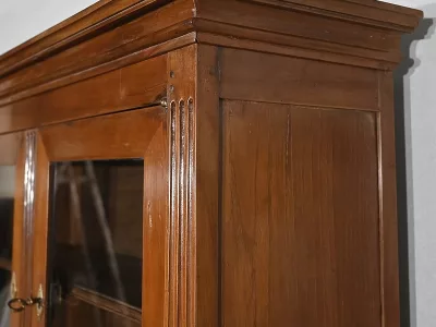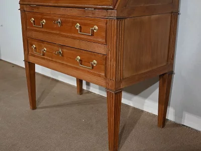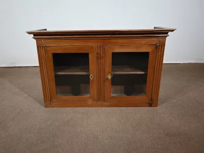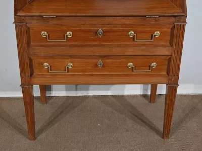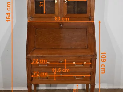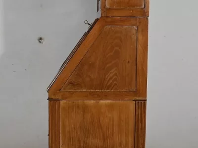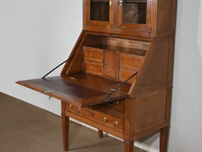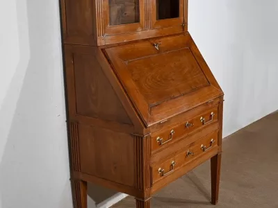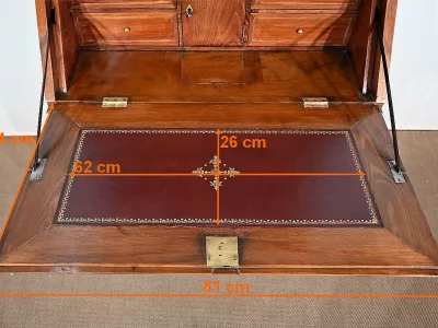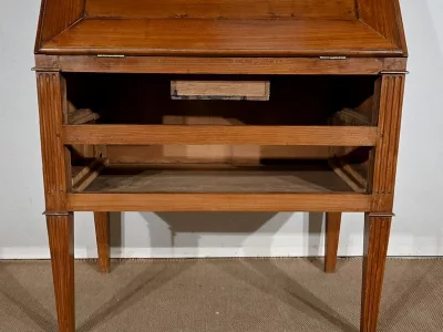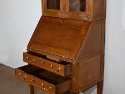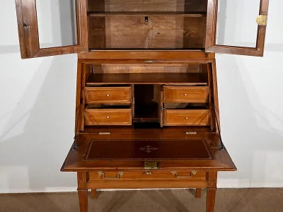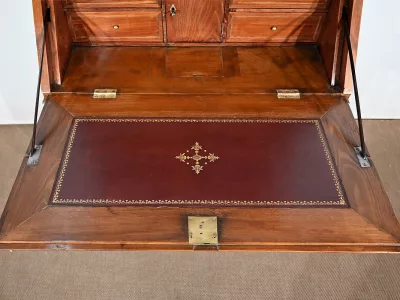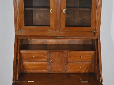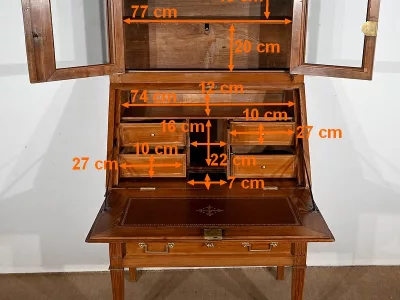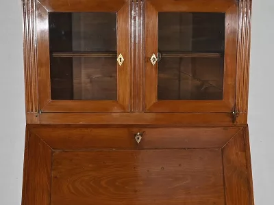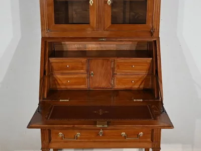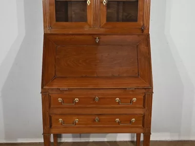 Enfin, ce bureau de pente est sommé de deux portes vitrées à encadrement à coupe d’onglet en merisier, de montants à cannelures et d’une corniche chapeautée.