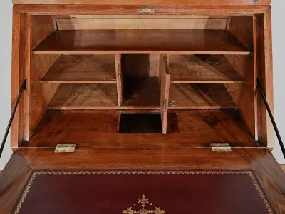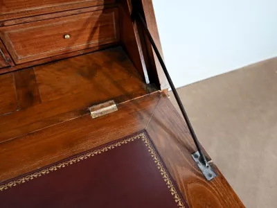Cet abattant s’ouvre sur des charnières en laiton et est retenu par des compas en fer d’origine. A l’intérieur nous découvrons un cuir neuf de couleur lie de vin avec vignette et une composition à quatre motifs.