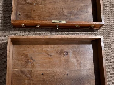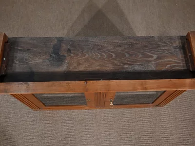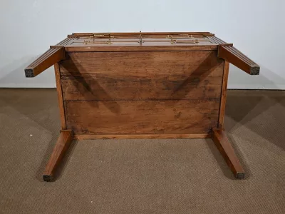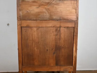 L’abattant présente un cadre à coupe d’onglet, foncé d’un panneau d’une seule planche sans joint. Son pourtour est constitué d’une moulure en quart de rond et il se ferme grâce à une serrure d’origine en état de fonctionnement accompagnée de sa clé et d’une entrée losange en bronze.