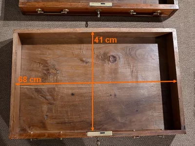 La partie intérieure présente une porte avec deux tiroirs identiques de chaque côté, une large niche, un tabernacle avec serrure d’origine en état de fonctionnement et une tablette coulissante à onglet découvrant un espace de rangement secret.