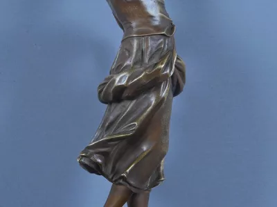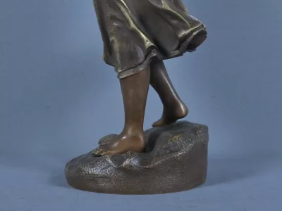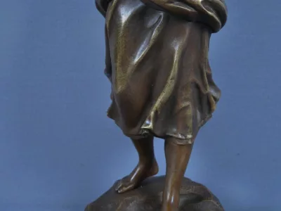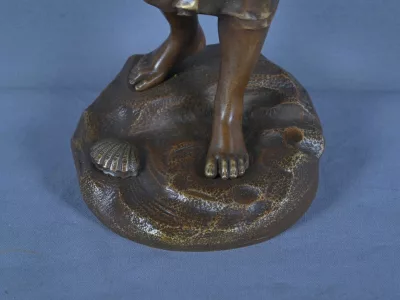 La figure féminine, pieds nus sur un socle évoquant un rivage rocailleux, se tient debout, le bras droit levé dans un geste aérien, tandis que le gauche repose sur sa hanche dans une attitude à la fois naturelle et stylisée. Sa robe fluide, finement ciselée, laisse deviner les plis du tissu et les lacets du corsage, témoignant d’un travail de fonte et de finition d’une grande finesse. La coiffure courte et ondulée, portant une coiffe, ajoute une touche d’authenticité à cette scène bucolique. A ses pieds, un grand coquillage évoque la pêche.