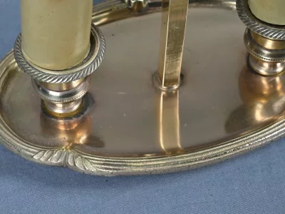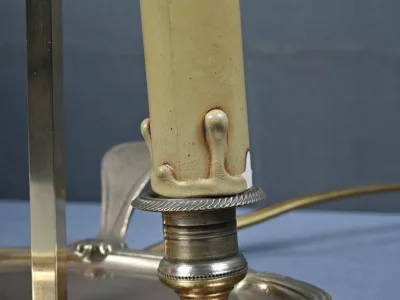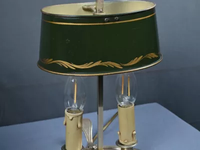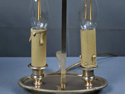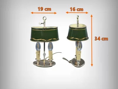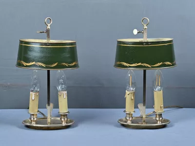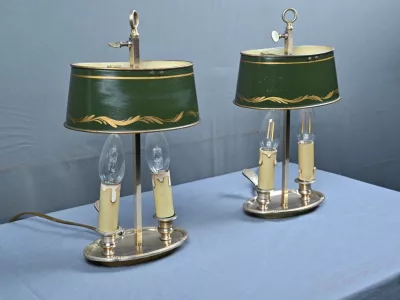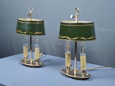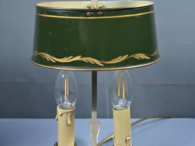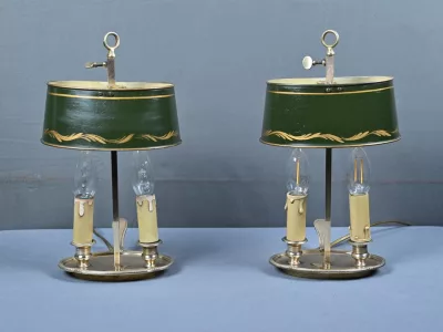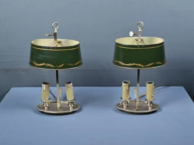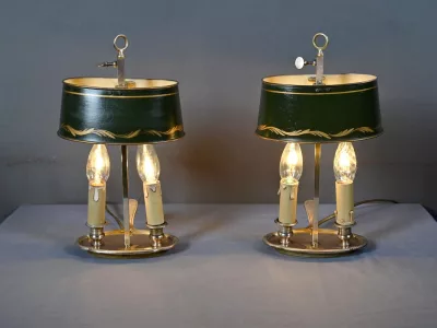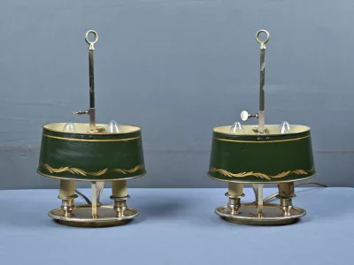Élégante paire de lampes dites Bouillotte, en laiton doré, à deux bras de lumière. Chaque bras accueille une douille en forme de bougie, simulant la cire fondue, dans l’esprit des luminaires du XIXe siècle. Le fût central est agrémenté d’un abat-jour ovalisé en tôle verte, réglable en hauteur grâce à une tige coulissante à molette. L’abat-jour est délicatement orné d’un filet doré et d’une frise florale stylisée, apportant une touche décorative subtile et classique.