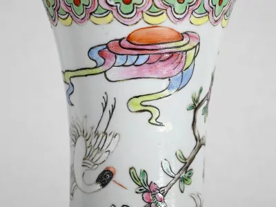 Une scène illustrant la faune et la flore forme une longue frise entourant la lampe. De grandes fleurs, des branchages et des oiseaux bigarrés, sont accompagnés d’arabesques.