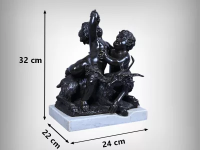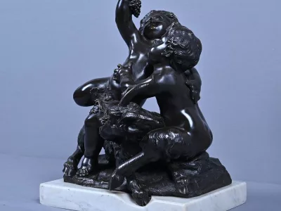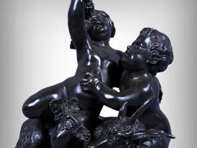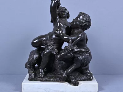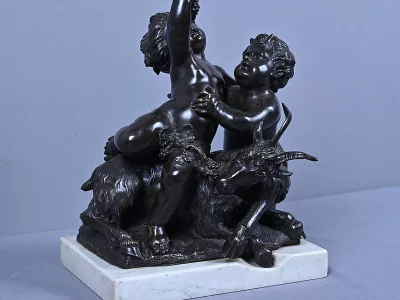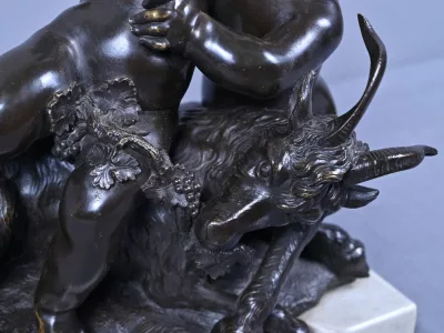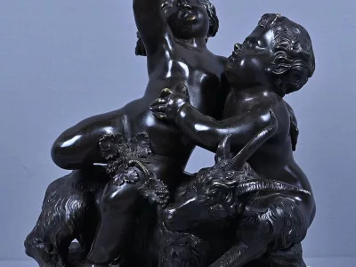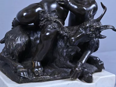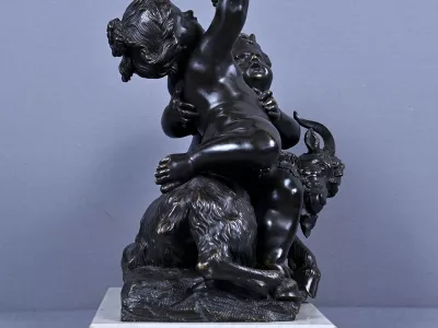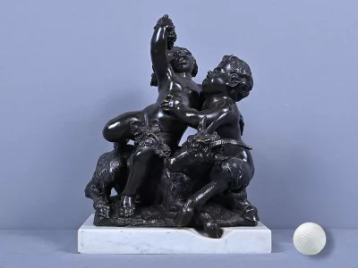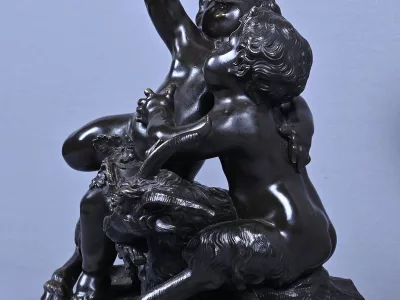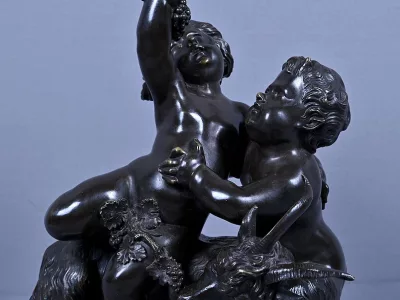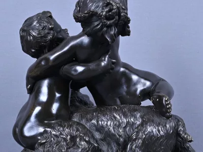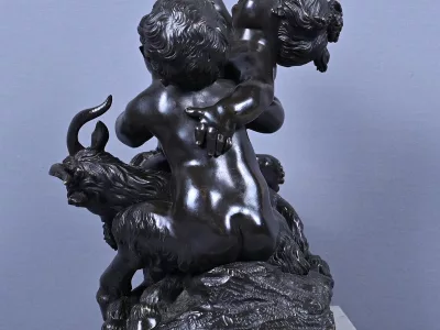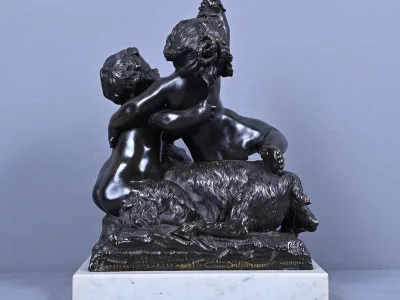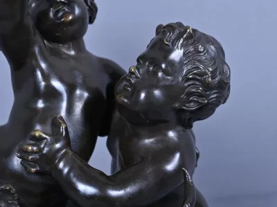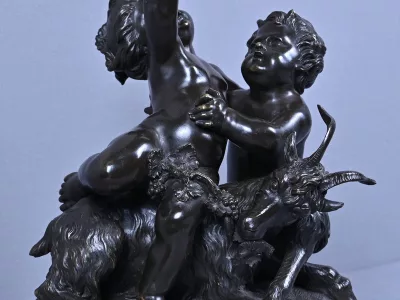 Intitulé L’Enfance de Bacchus, ce bronze patiné d’une grande finesse est une œuvre emblématique du style gracieux et expressif de Clodion, maître incontesté de la sculpture du XVIIIe siècle. Sur un socle en marbre veiné qui souligne la noblesse du sujet, deux enfants aux traits délicatement modelés incarnent l’esprit de Bacchus dans une scène pastorale empreinte de vivacité. Bacchus, juché sur le dos d’un bouc au pelage finement ciselé, brandit une grappe de raisin dans un geste triomphant, tandis qu’un faune regarde comme fasciné avec une naïveté joyeuse. Le mouvement est fluide et chaque détail — des boucles des cheveux aux feuilles de vignes — témoigne d’un savoir-faire. L’ensemble possède une profondeur visuelle remarquable et la signature de Clodion est présente sur la terrasse. Cette composition dynamique et mythologique, célèbre l’innocence et l’abondance dans une esthétique néoclassique raffinée. Une pièce de collection rare, idéale pour les amateurs d’art ancien, les passionnés de mythologie ou les intérieurs élégants en quête d’une œuvre à la fois décorative et historique.