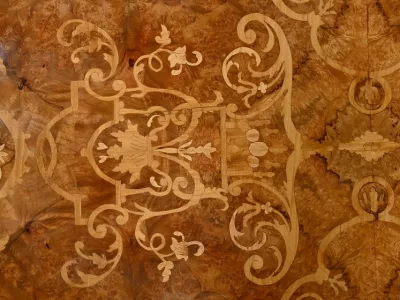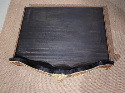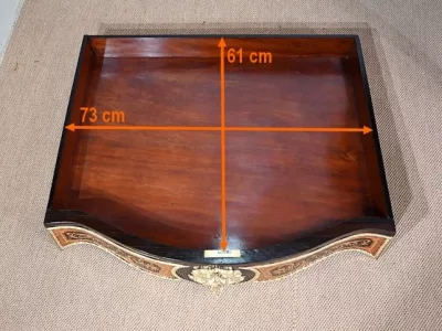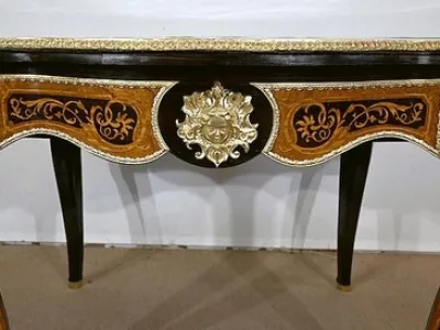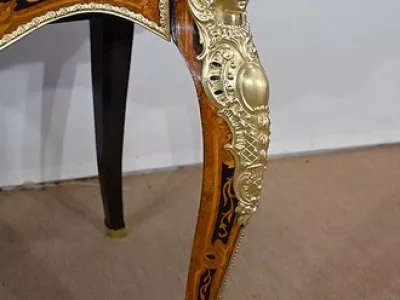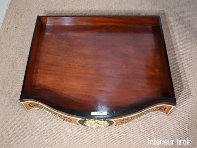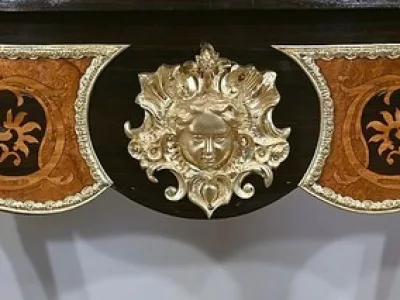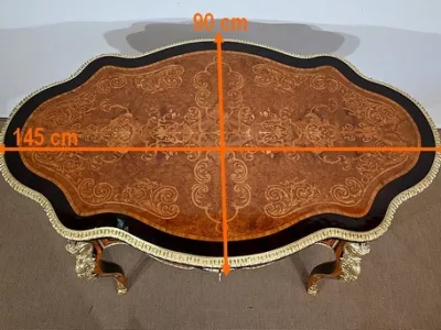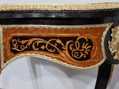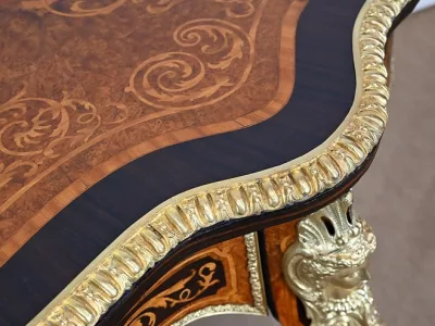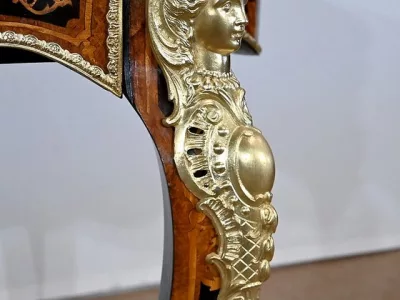 Ce mobilier d’exception présente un dessus marqueté de loupe de thuya et de citronnier formant des arabesques et des volutes raffinées. Autour, une large bande de palissandre est mise en valeur par une baguette en bronze ciselé qui suit les courbes du meuble.