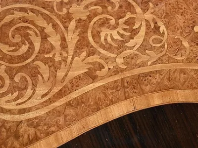 Table d’apparat de forme violonée munie d’une marqueterie de bois précieux alliant palissandre, loupe de thuya et citronnier.