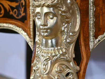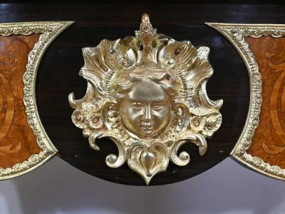 La ceinture galbée, épousant les lignes du dessus, ouvre en façade par un grand tiroir décoré de loupe de thuya et de citronnier, sur un fond en palissandre. Ce tiroir est entouré d’une baguette en bronze et présente en son centre une importante sculpture, en bronze également, représentant le visage d’un enfant accompagné de fleurs et de volutes, sur un fond en palissandre.
