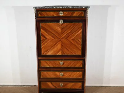 Secrétaire en placage de bois de rose surmonté d’un marbre « Sainte Anne des Pyrénées », à gorge, et d’époque.