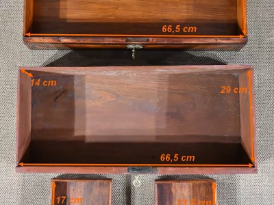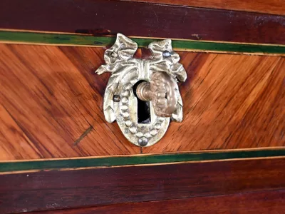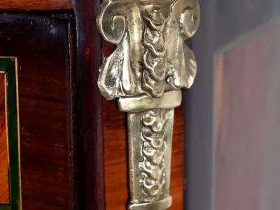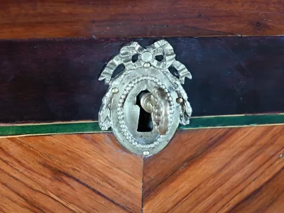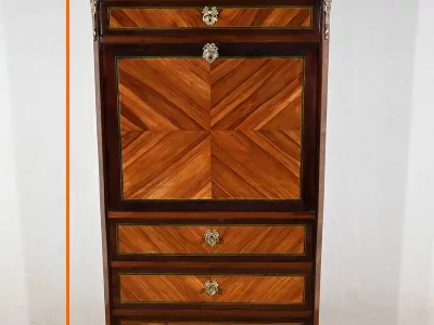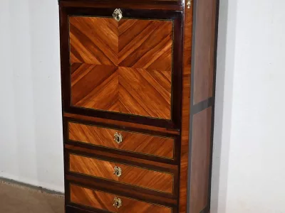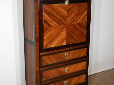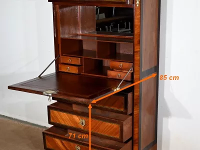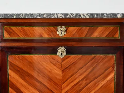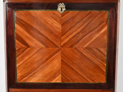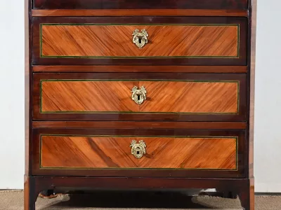 Ce meuble unique ouvre par un abattant, un tiroir en partie haute et trois identiques en partie basse. Chacun est muni d’une serrure fonctionnelle d’origine, d’une entrée en bronze ciselé et d’une clé postérieure. Les façades, en placage de bois de rose disposé en éventail, sont agrémentées de filets de bois teinté vert, de buis et d’entourages en acajou.