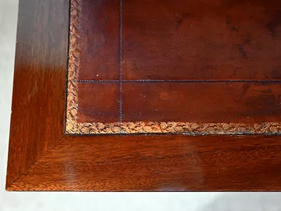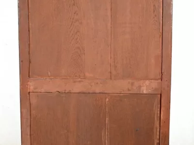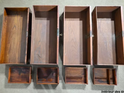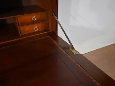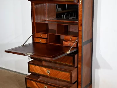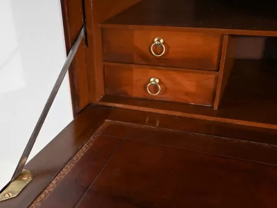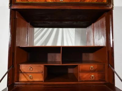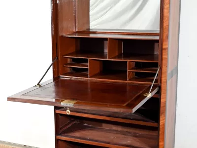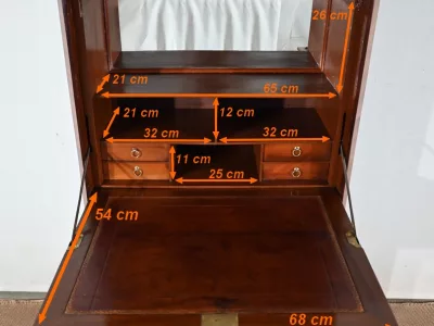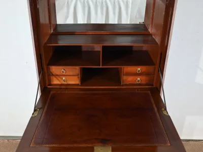 L’abattant ouvre sur un espace de rangement composé de quatre petits tiroirs et d’une niche, sommés de deux casiers et garni d’un miroir. La partie écritoire offre un cuir rouge, avec vignette dorée et liseré à froid. Cet abattant est maintenu par des crochets fer et des platines laiton.