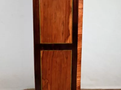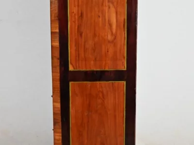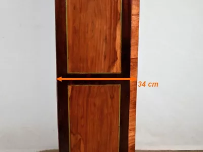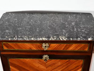 Les montants et pieds à pans coupés sont plaqués à l’horizontale et ornés de chutes de bronze.
