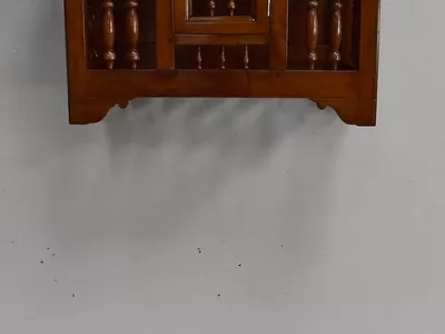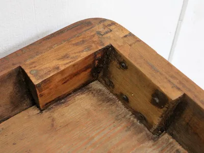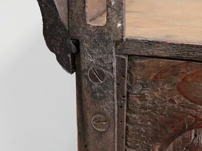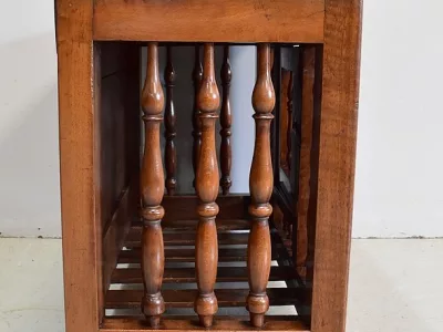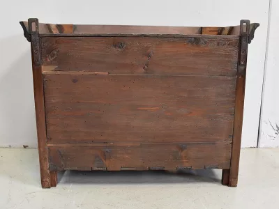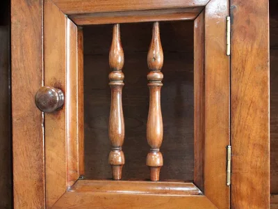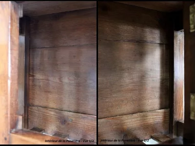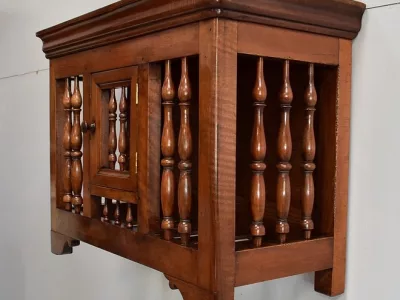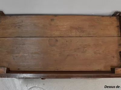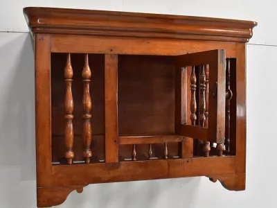 Ce meuble Régional, fréquemment présent dans les maisons Bretonnes ou Provenciales du XIXe siècle, est sommé d’une Corniche taillée à Doucine. Le fond est ajouré, constitué de tasseaux plats. Cette Panetière peut reposer sur ses quatre pieds, découpés à l’avant, droits à l’arrière. Toutefois deux crochets en Fer permettent également de l’accrocher au mur, position initialement privilégiée pour rendre son contenu hors de portée des rongeurs.