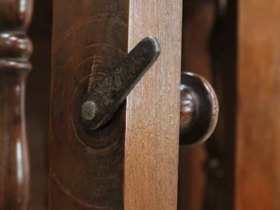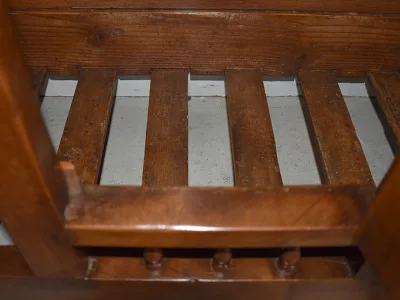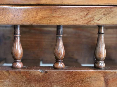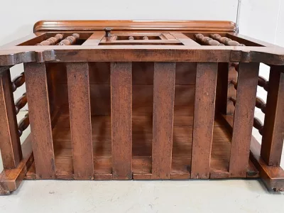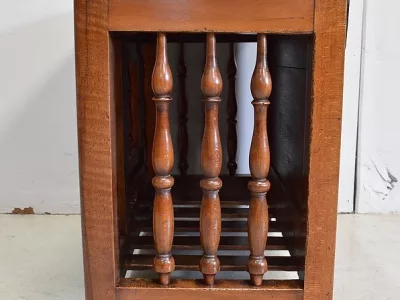 Sa caisse à Claire-voie est composée de Colonnettes en bois tourné, conception favorisant la conservation d’un élément historiquement central dans notre alimentation : le Pain.