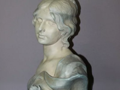Important buste de jeune femme à la rose d'époque Art Nouveau en céramique à patine Bleu vert , signé en creux Bernstamm pour Léopold Bernard Bernstamm 1859 /1939 , édition Emile Muller à paris , vers 1900 , ensemble en très bon état
