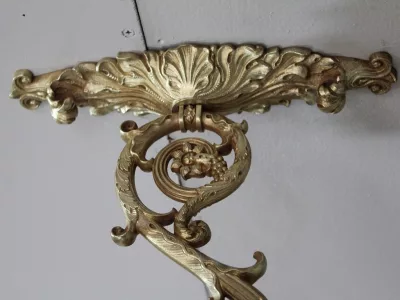 Élégante paire d'appliques porte-torchères en bronze doré style Louis XIV. Le bras est orné de rinceaux aboutissant à un réceptacle pour y loger une source de lumière.