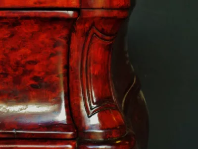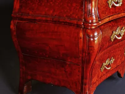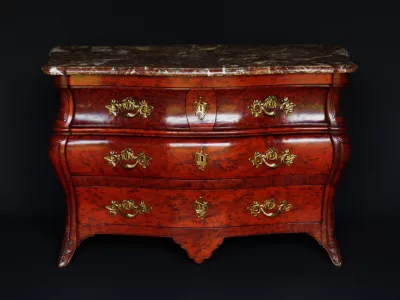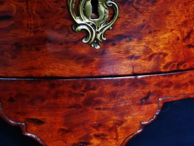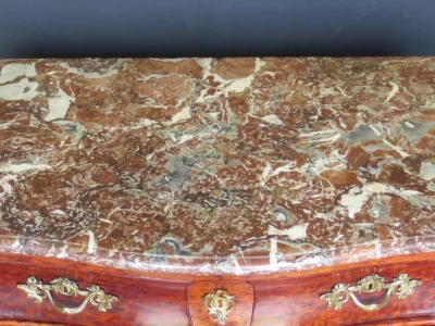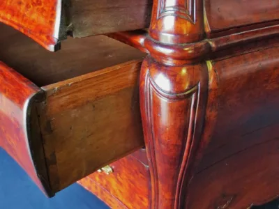 Cette belle commode Bordelaise Louis XV est dite de forme tombeau, elle est en acajou massif et moucheté de très belle qualité massif. La façade galbée présente quatre tiroirs sur trois rangs, ils sont ornés d' entrées de serrures et de poignées en bronze. Les cotés sont galbés et évasés. Les pieds antérieurs sont moulurés et sculptés dans le bas d'une feuille d' acanthe se terminant par une petite volute. La traverse basse de façade est ornée d' un tablier en son centre et d' écoinçons à chaque extrémité.
