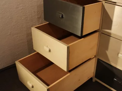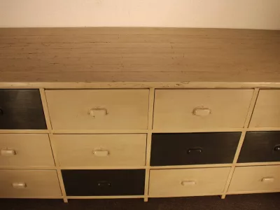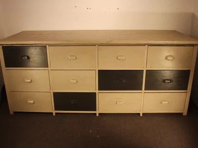 Meuble de métier, modiste, vers 1930 – 1940, en sapin peint, composé de 12 gros tiroirs, permettant un rangement optimum, poignées en métal, patine dans les tons de taupe et ardoise.