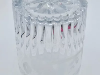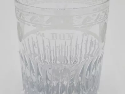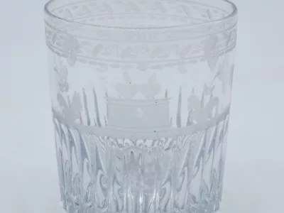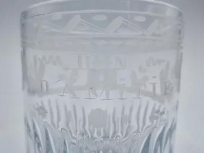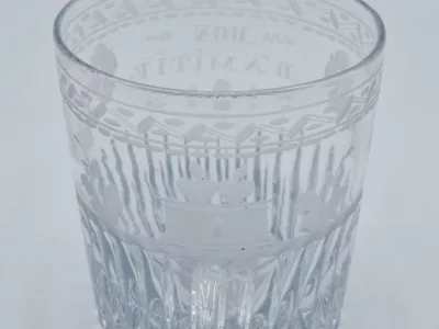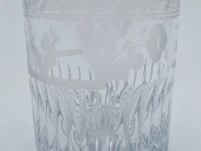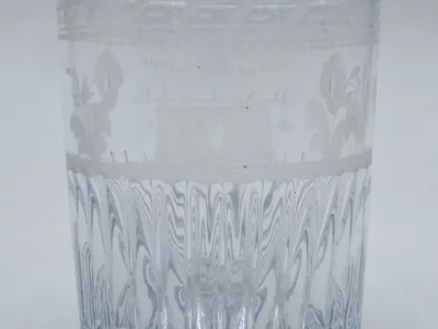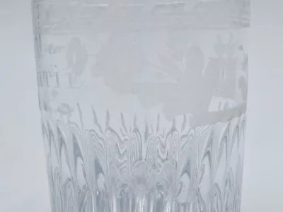 Ce verre cylindrique est en cristal soufflé et moulé, la base est godronnée et l' envers est taillé d'un motif en forme d'étoile. Il est gravé à la roue sur le pourtour et porte en façade, sur un coté l' inscription « Don d'Amitié », et sur l' autre figure un autel, surmonté de deux cœurs, bordé de part et d'autre de fleurs. Le col est gravé d'une frise de motifs géométriques.