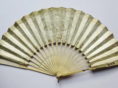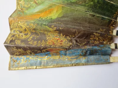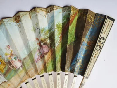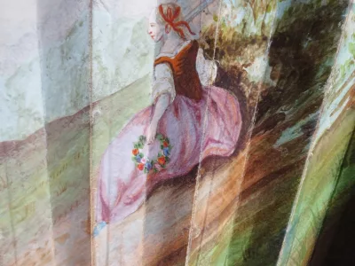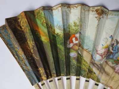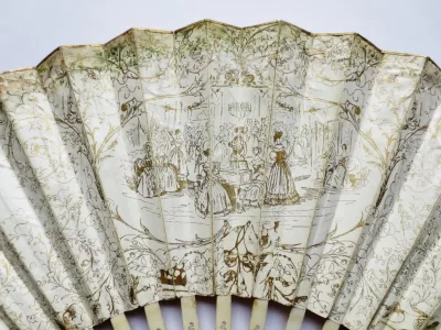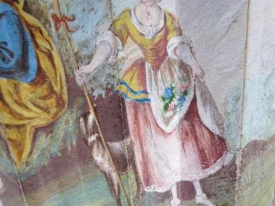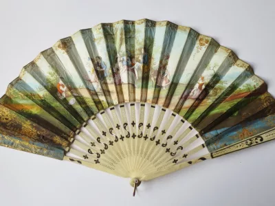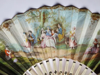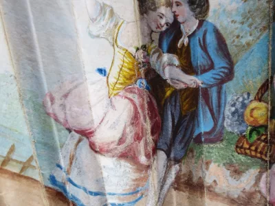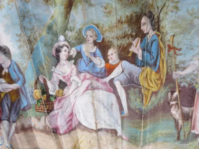 Cet éventail est à 20 brins, il présente sur une face, une scène de genre peinte à la gouache. Sur un fond de verdure, un couple danse accompagné par deux musiciens, il est observé par une bergère et une jeune paysanne assise sur la droite, trois jeunes femmes semblent cueillir des fleurs et les déposer dans un panier Les brins en os sont ajourés et ornés de motifs incrustés d’argent. Les deux premiers plis et la partie supérieure de l' éventail sont peint à l'or de motifs floraux, de bouquets dans des vasques, d' arabesques et de guirlandes. L' envers de l' éventail a du être restauré à la fin du XIXe siècle et une gravure représentant un concert de piano est contrecollée au dos.