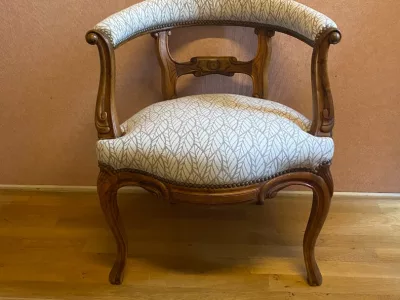 Fauteuil de bureau en noyer du 19 ème. De style Louis XV, ce fauteuil à été entièrement garni et retapissé. Parfait état.